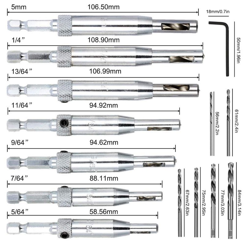 - 7 Different Size: Come with most common hinge screw sizes 5/64", 7/64", 9/64", 11/64", 13/64", 5mm, 1/4".