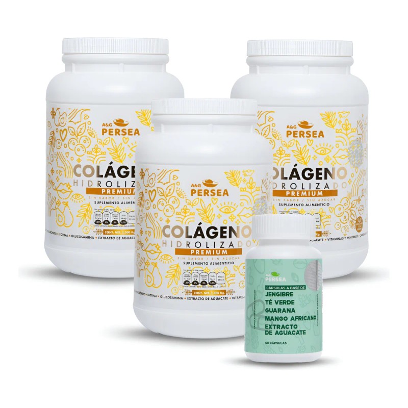 Pack 3 botes de colageno premium, sin sabor, sin azucar. Contiene 1 frasco DETOX, DE REGALO. Con 30 cápsulas Colágeno Premium 100% Hidrolizado sin Sabor | A&G Persea | 1. 2 kg A&G Persea es una marca líder en suplementos de alta calidad en México, con más de 5 años en el mercado. Somos la única marca que combina colágeno 100% hidrolizado con cartílago de tiburón, glucosamina y extracto de aguacate, una fórmula única y avanzada para el cuidado integral de articulaciones, huesos, piel, cabello y uñas. Fórmula premium enriquecida con biotina, ácido hialurónico, vitaminas y minerales esenciales. Ideal para personas que buscan fortalecer su cuerpo desde adentro, con ingredientes de origen natural y alta biodisponibilidad.