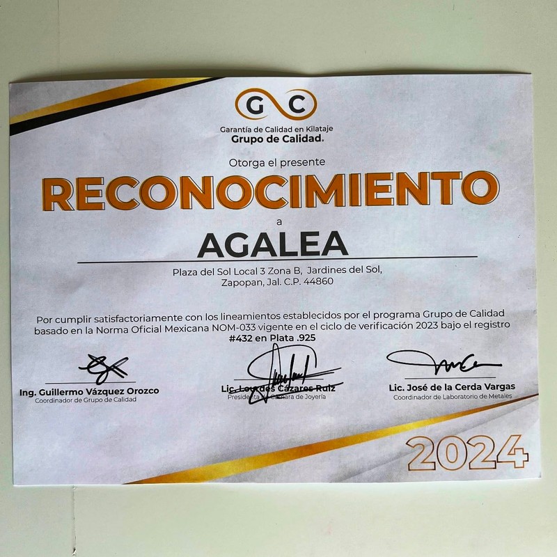 - 💎 CALIDAD: Agálea expedirá un certificado por escrito que avala la pureza de nuestra plata de ley .925, verificado por la cámara de joyería de Jalisco bajo el registro 432.