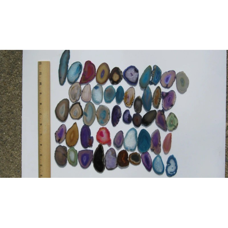 The pictures above are 5 different 10 piece sample lots, you will receive a similar lot. Each lot will contain a nice variety of colors, shapes, and sizes. Great for many different applications-Jewelry, stainglass, tile, mosaics, windchimes, wire wrap, and many other craft projects. Very colorful lot with nice variety and shapes. There is a ruler in a couple pics for size reference. Our small size, approx. 2" x 1" some a bit larger some smaller. We got a good deal on these specimens and were passing it on! Thank you so much for stopping by!, and please check out our other Agate slice listings and feedback.