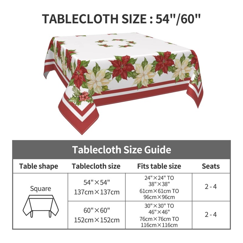 - 【Easy Care】 Machine washable in cold water. Tumble dry low heat or air dry; Warm ironing if needed. No bleaching. Our red and white poinsettia square tablecloth is spillproof, fade resistant, stain resistant and wrinkle free.