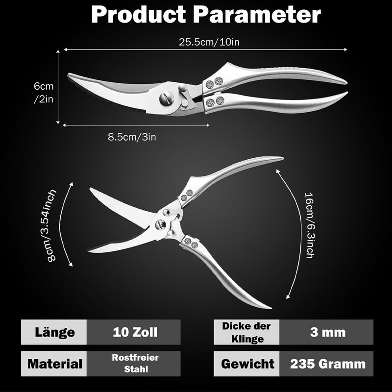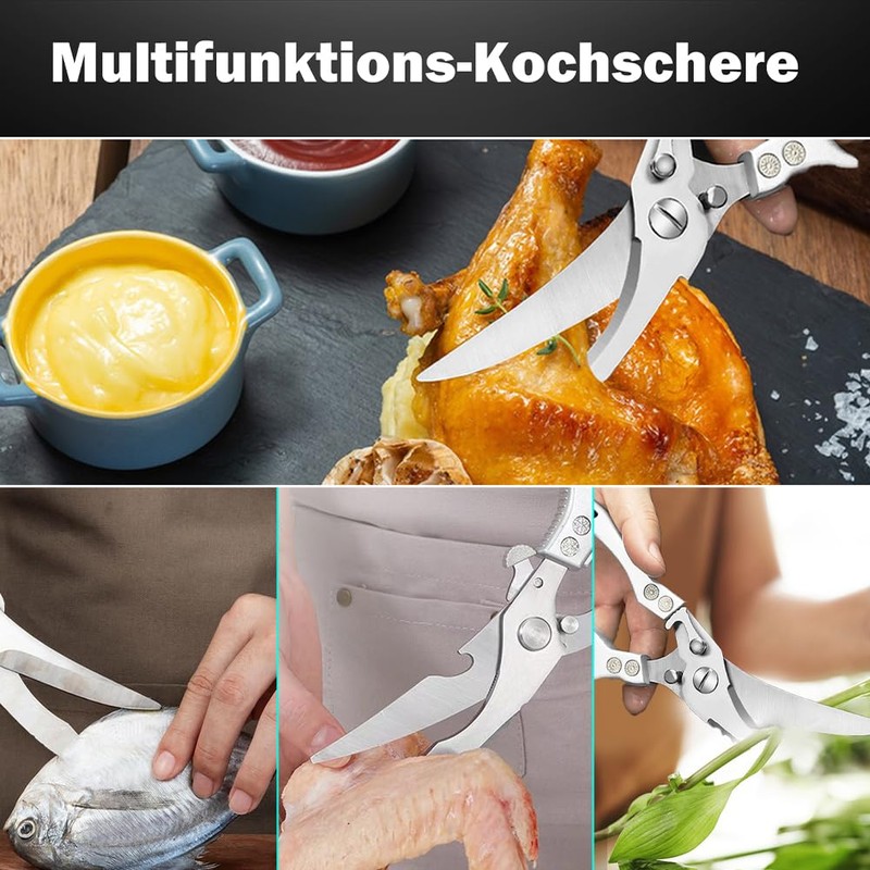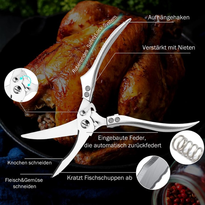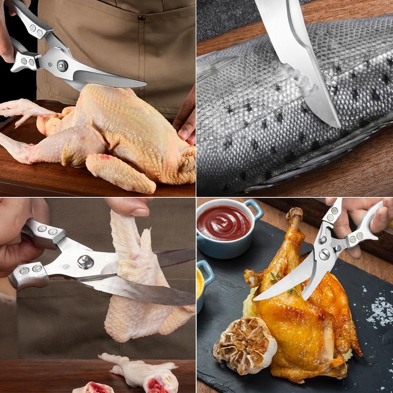 • Universal cake scissors: The kitchen scissors stainless steel sharp professional are super sharp, making them an ideal helper when cutting chicken bones, ribs and turkey on Thanksgiving. It can also be used as barbecue scissors for cutting roasts, vegetables and bacon, or as lobster scissors for cutting crab scissors, crab heads and open fish. One of the serrated blades can be used to shed fish.