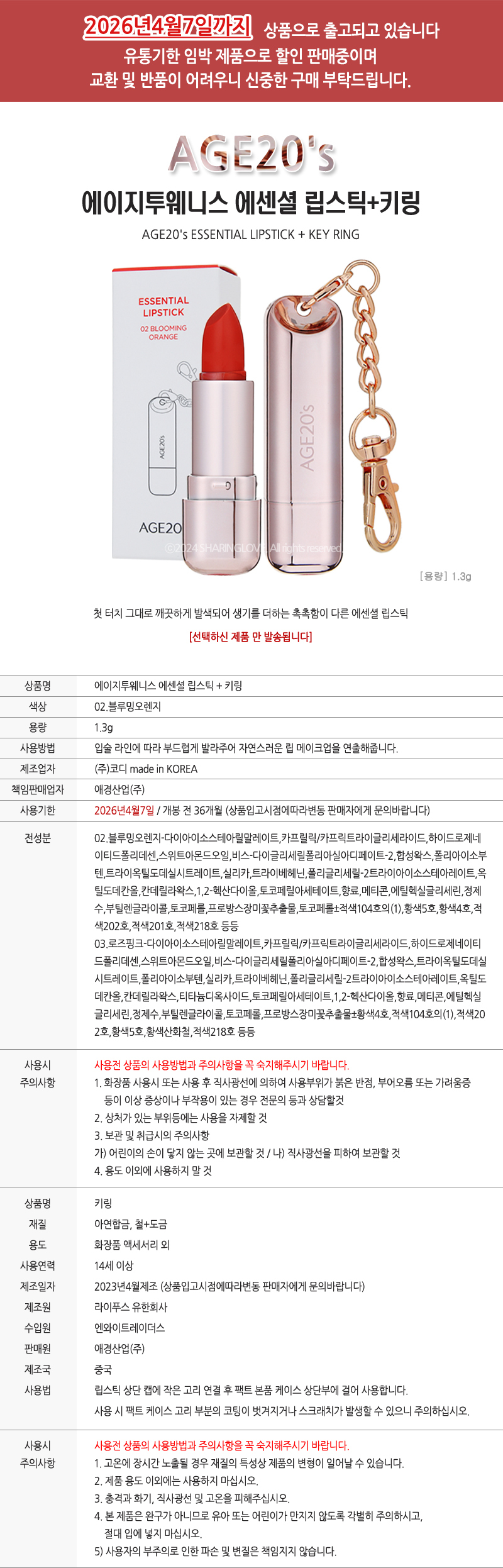Age 20's Essential Lipstick 02 Blooming Orange + Keyring / 에이지투웨니스 에센셜 립스틱 02 블루밍 오렌지+키링
