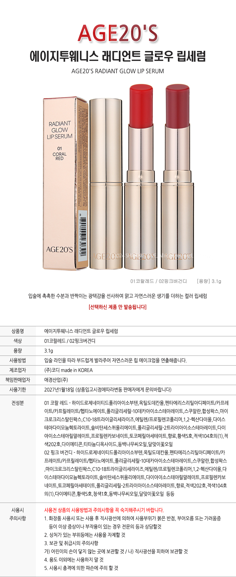 Age 20's Radiant Glow Lip Serum 01 Coral Red / 에이지투웨니스 레디언트 글로우 립세럼 01코랄레드