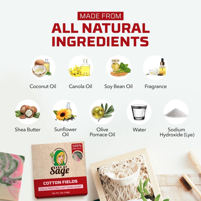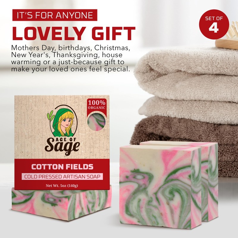 - WOMEN'S SOAP BAR COTTON FIELDS SCENT: Rejuvenate your mind, body, and soul as Age of Sage lets you feel an excellent bathing shower experience with its Handmade Cotton Fields Scent men's bar soap. Each body bar soap is made with a distinctive natural soap for women or a Cotton Fields-inspired fragrance that cleanses your skin while keeping it moisturized and nourished.