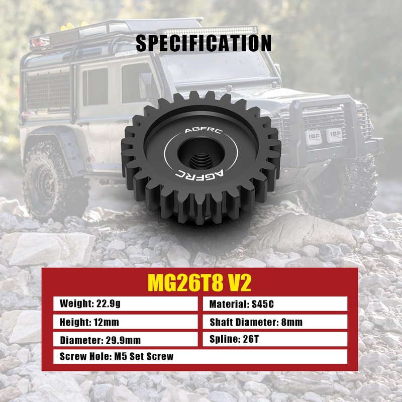AGFRC PG26T8 V2 hardened steel gear allows to fine turn the gearing of your vehicle, which comes with 2pcs M5 set screws with for extra secure tight fitting. Perfect for high speed runs and drag racing application, 1/8 scale buggy and truggy conversions.