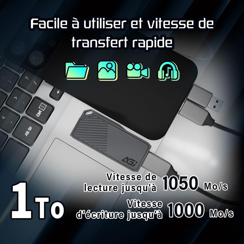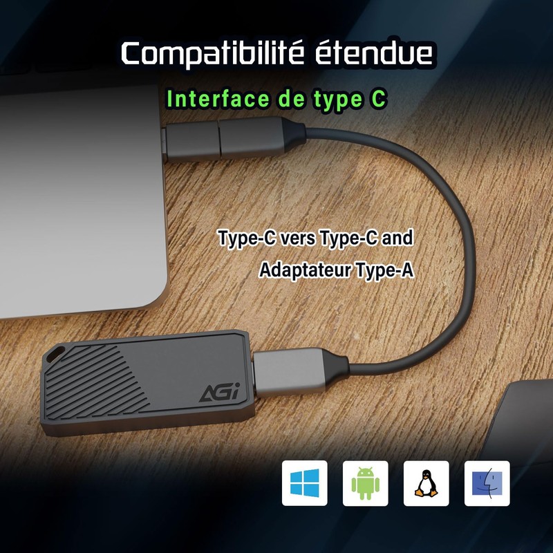 AGI ED238 1TB Portable SSD, USB-C USB 3.2 Gen 2, External NVMe, Read Speeds up to 1050MB/s, Compatible with PC, Windows, Mac, Linux and Android - Iron Grey
