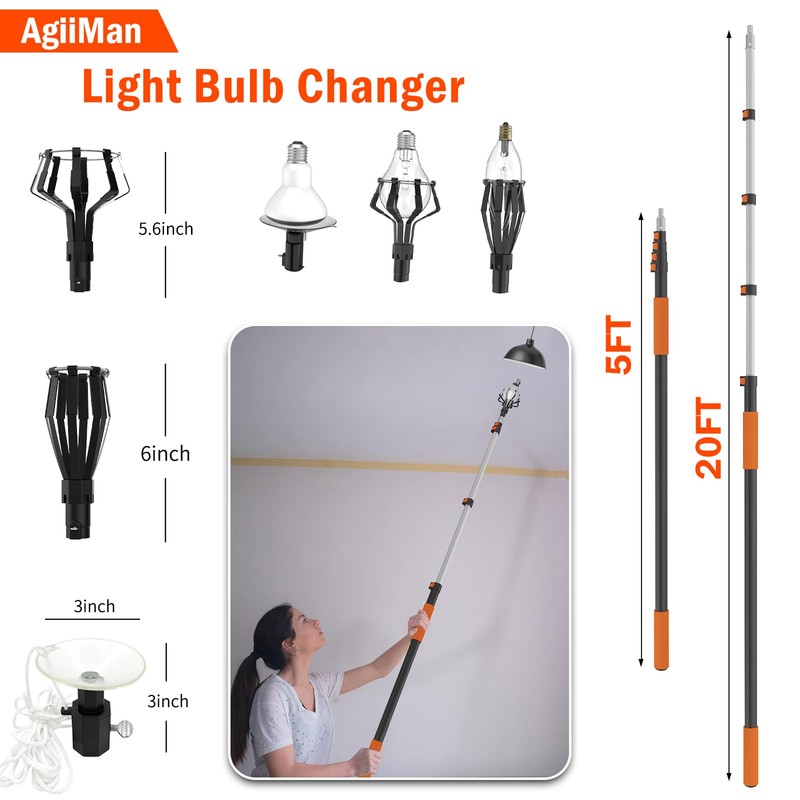 - Complete Bulb Changing Kit: The Agiiman light bulb changer for high ceilings includes a telescopic extension pole, suction cups, and large and small eight finger cages to provide you with everything you need to efficiently change light bulbs