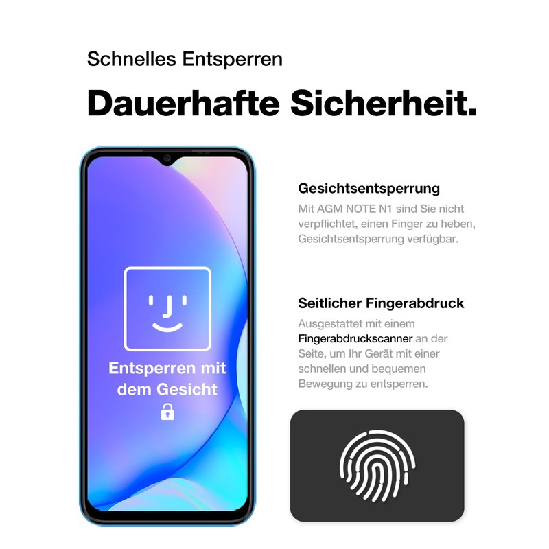 - Fingerprint & Face ID & Multi-function: With the AGM Note N1 Lite mobile phone, you can easily and quickly unlock thanks to the built-in fingerprint sensor and the power button 2-in-1 function. Even you do not need to stir a finger, the face unlock is available.