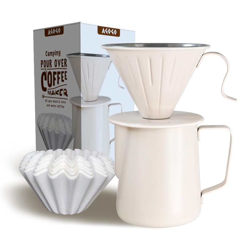 AGOGO Camping Pour Over Coffeemaker Set with Paper Filter Stainless Steel (Cream, 600ml)
