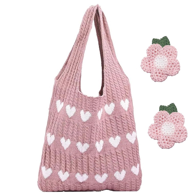 - KNITTED LOVE PATTERN The beach bag uses the knitted heart pattern as the design. In combination with two pink flowers, the flowers can stick or sew with glue by themselves. This pattern contributes to the cuteness and warmth of the knitted bag. The large beach bag design of the heart pattern makes the knitted bag more attractive and cute bag becomes the highlight of the fashion style.