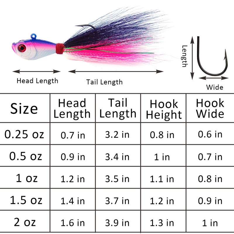 - Package include: 4pcs/ pack same color and size bucktail jig. 4 Color and 5 Size avaible
