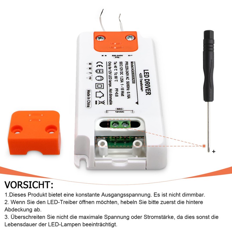 - Bitte beachten: Die kombinierte Wattleistung der angeschlossenen LED-Leuchten darf 15 Watt nicht berschreiten. Um die Lebensdauer zu verl?ngern, ist es blich, die Last innerhalb von 85 % der Kapazit?t des LED-Netzteils zu halten!