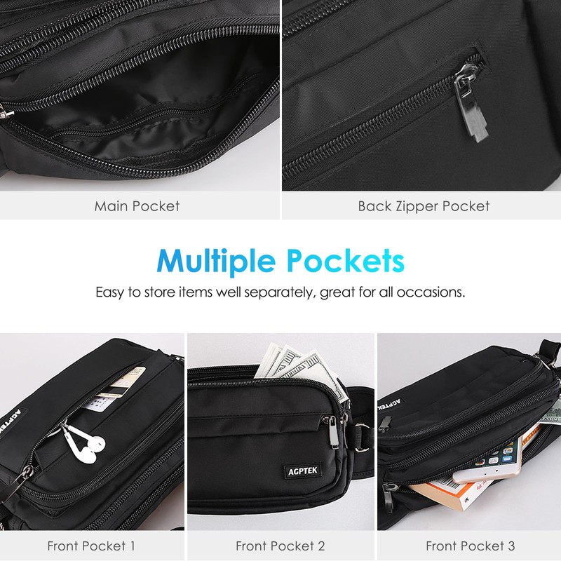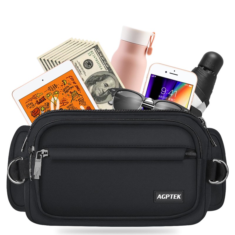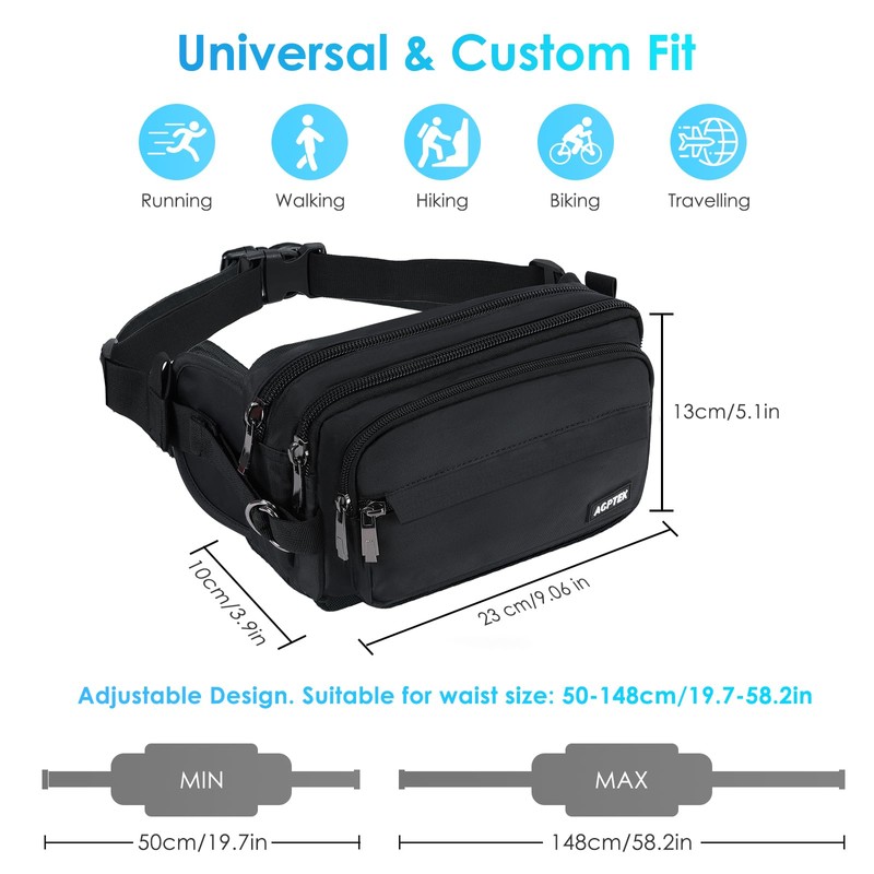 AGPTEK Bum Bag, Large Capacity Waist Fanny Pack for Men Women, Adjustable & Waterproof Bumbag Running Belt for Travel, Running, Shopping, Hiking, Dog Walking, Cycling, Climbing, Black, S