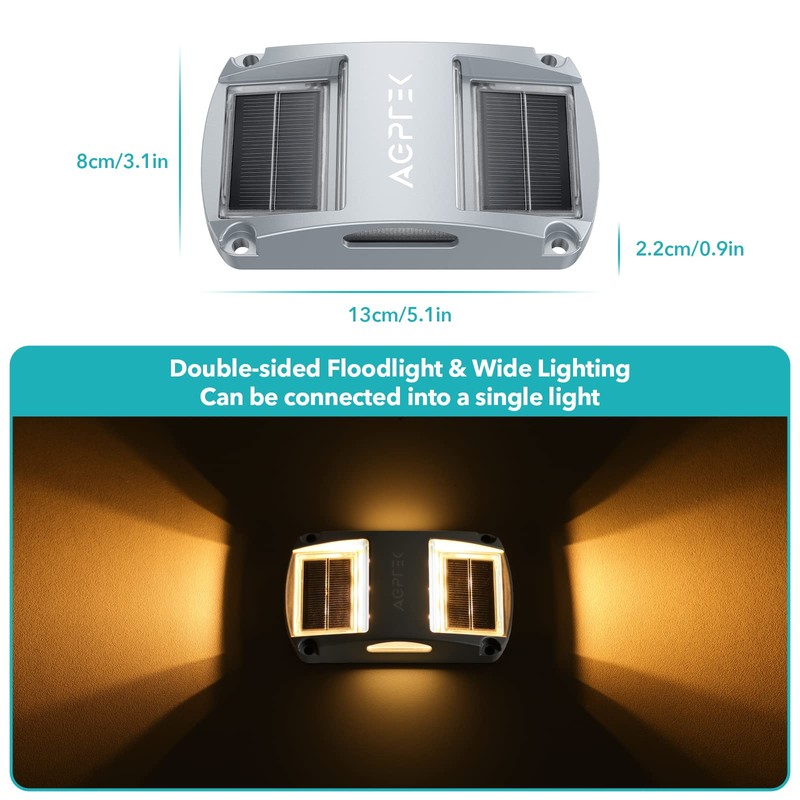 - 【Unique Design Solar Deck Lights】Our solar driveway lights adopts unique Car Shape Double-sided Design which makes these outdoor solar lights glow more evenly without spots, also the lighting effect can be connected into a straight line. A great solar marker lights for different place, like driveway, sidewalk, pathway, steps and docks and etc