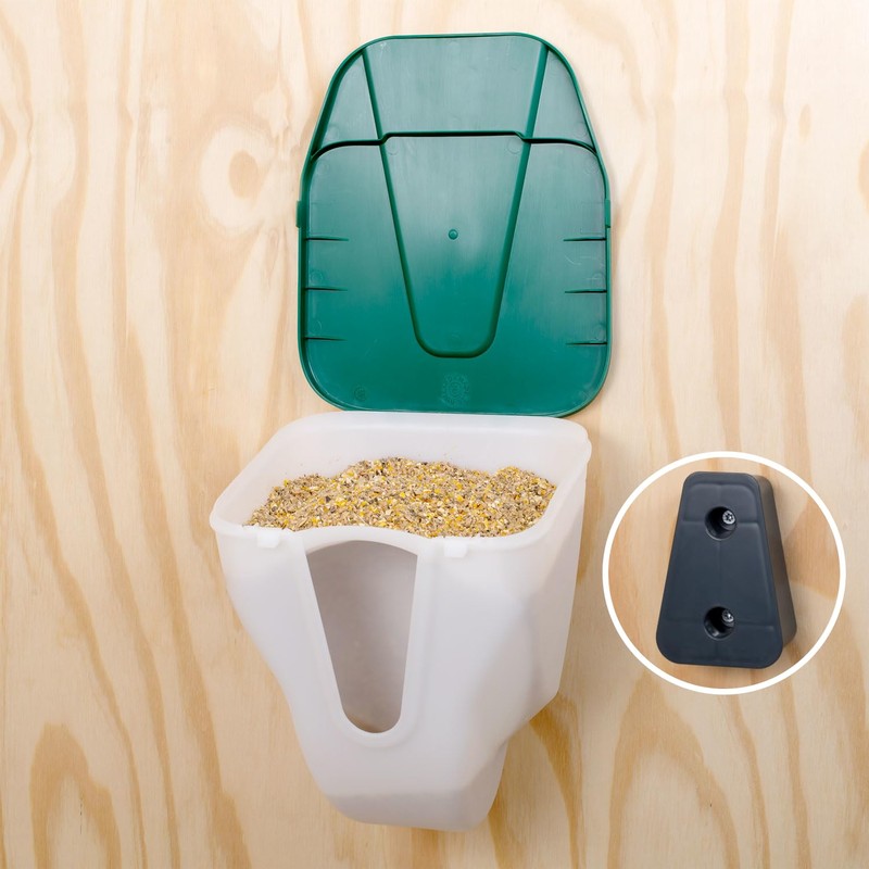 - Product details: 1x Agrarflora V-Feedr poultry feeder, 1x wall bracket, material: PP plastic, colour: green, white, contents: 2.5 kg, dimensions: approx. 22 x 22 x 27 cm, weight: approx. 250 g.