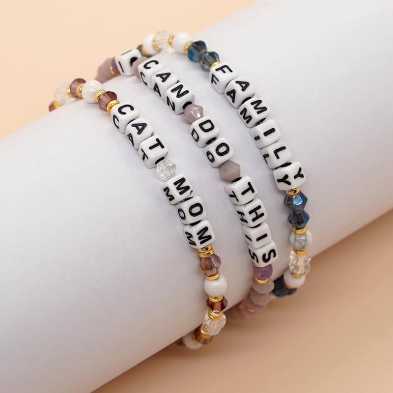 - Lovely fancy stackable handmade beaded alphabet script bracelets, featuring a stunning array of colorful crystal beads and elegant gold balls with different letter wordings, you can even order your custom bracelet.