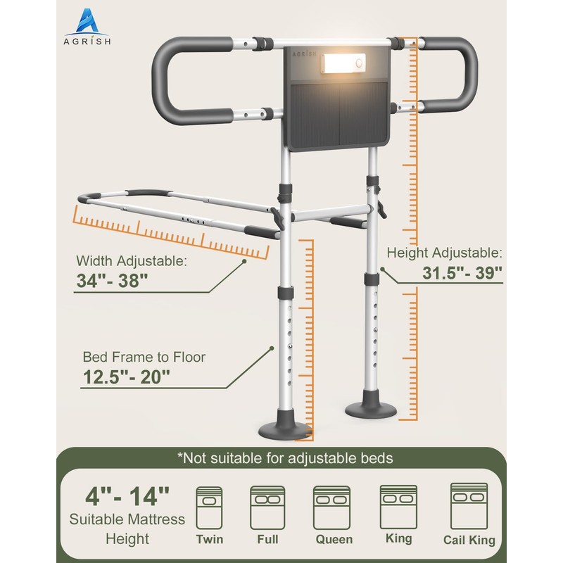 • FIT MOST BED: Agrish bed cane caters to beds of all sizes (Twin, Queen, California king). But NOT for adjustable beds. Adjustable height to minimize fall risks, fit thick mattress up to 15" and bed frame up to 20.8"