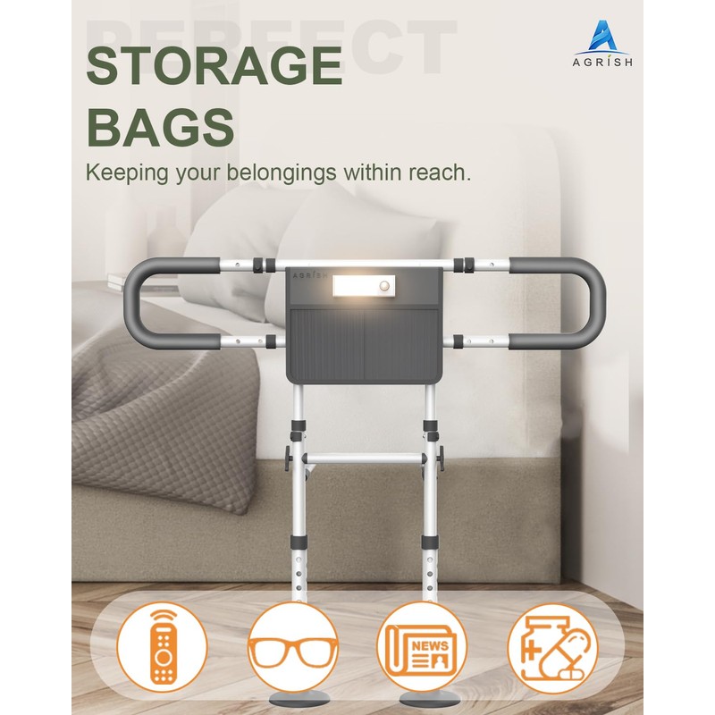 • HUMANIZED DESIGN: Agrish bed rails feature a flat tube design alleviate discomfort from sleeping over the rail. Meanwhile, the bed rails with storage bags for easy access to essentials like glasses and remote controls, enhancing convenience
