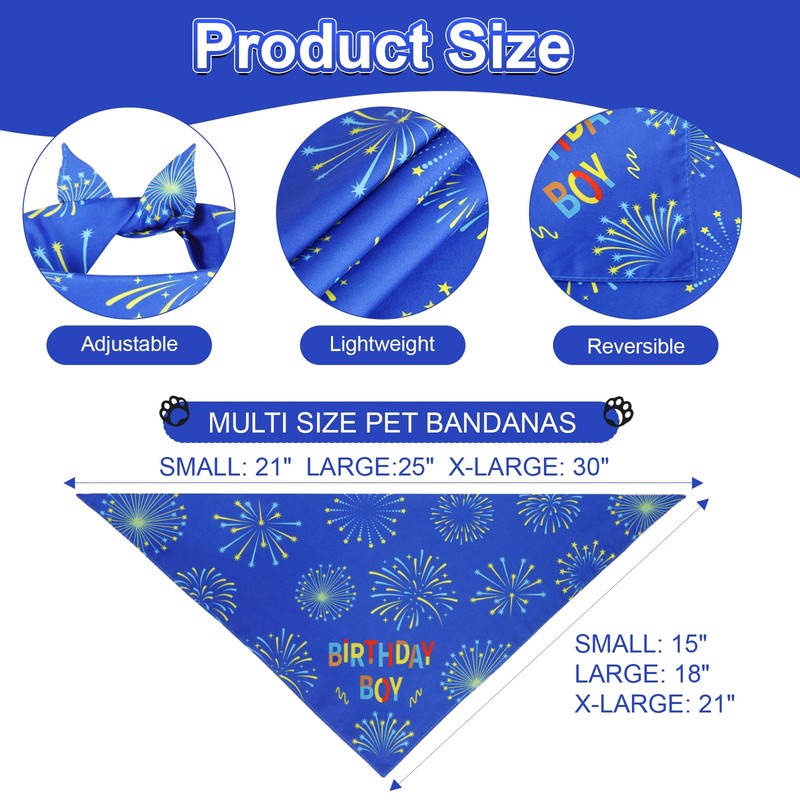 • Birthday Dog Bandana: Bright fireworks printed on a blue birthday bandana perfect for celebrating your beloved pets birthday, which is fashionable , "BIRTHDAY BOY" printed on the front is very suitable for birthday parties, and "IT'S MY BIRTHDAY"printing on the back, let's make your pet show lovely.