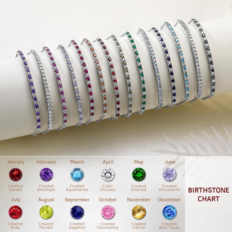 - Birthstone Bracelets for Women : this Tennis Bracelets featuring 2mm round cut birthstones in 4-prong basket setting. Very nice and vibrant looking.