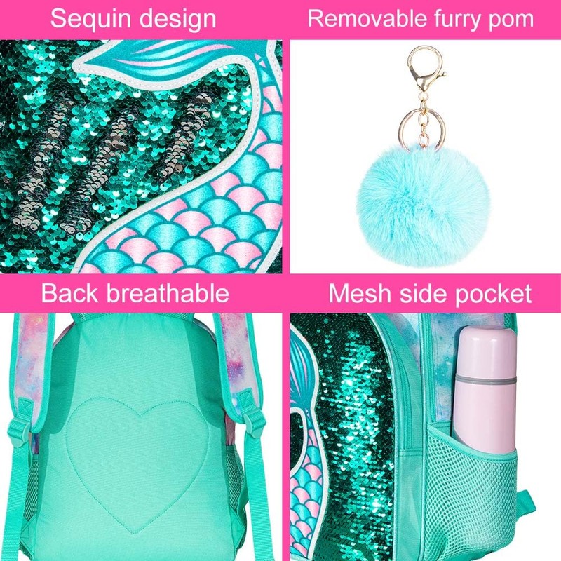 - CUTE SEQUIN BACKPACK DESIGN: This kids backpack is inspired by cute and eye catching mermaid tail design. The front pocket is designed by reversible sequin material, which will attract your kids enjoy self playing.