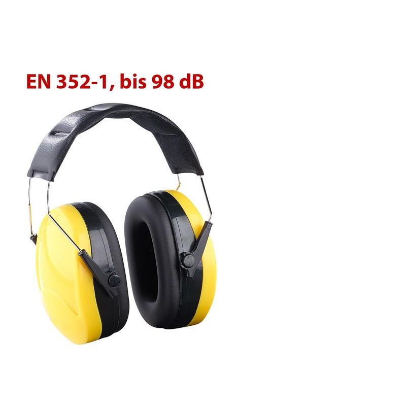 - Ear protection according to EN 352-1. Protects against noise up to 98 dB. Flexible headband made of spring steel, padded and adjustable. Soft padded ear protection capsules. Universal size. Also ideal for long-term use