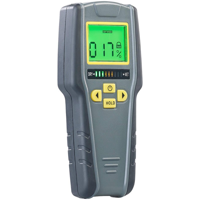 - Ideal for checking building materials, furniture, cladding and much more. No damage to the surfaces thanks to non-invasive measurement. Measures hardwood, softwood, dry walls and masonry. Large, illuminated LCD display. Displays moisture value in percent and as a scale. Acoustic and optical alarm when measuring a humidity that is too high.