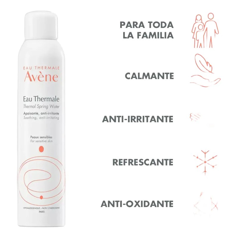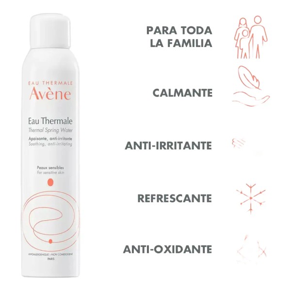 Agua termal avéne 300ml tiene propiedades calmantes, anti-irritantes y anti-oxidantes. Respeta el equilibrio fisiológico de la piel sensible y favorece su reparación. Normaliza la reactividad cutánea: la piel no tiene reacción desproporcionada