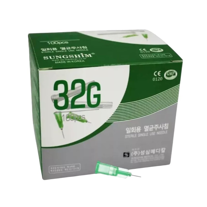 Aguja Sungshim calibre 32Gx5/32 (4mm) Caja C/100 Pzas, luer lock