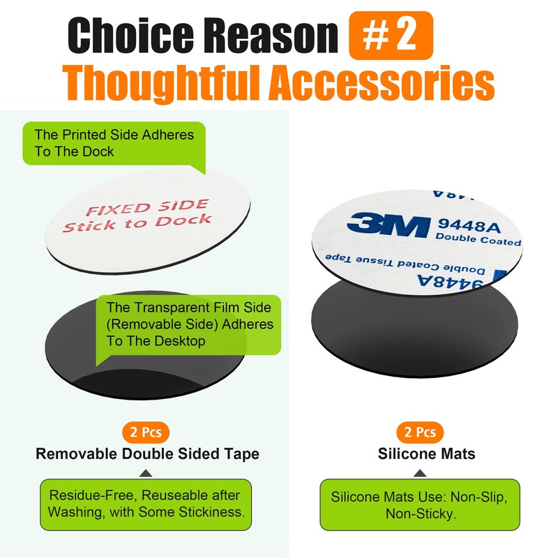- ⭕[Thoughtful Accessories] Included: 2 non-slip silicone pads, 2 removable double-sided adhesive pads. One side of the removable pads is the fixed side, which is attached to the dock bottom, and the other side is the removable side, which is attached to the desktop. The removable side has a certain adhesiveness and can be repeatedly attached and removed. If the removable side becomes dusty and its adhesiveness is reduced, it can be recovered by washing.