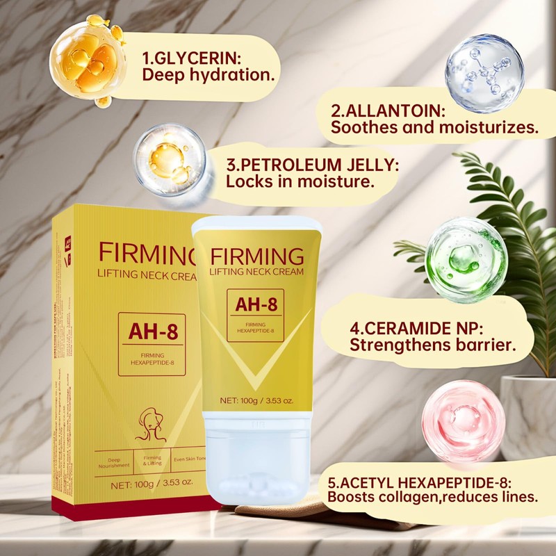 - [Dual-Action Firming Cream + Massage Roller] This lightweight Ah -8 firming neck cream with roller glides smoothly to boost absorption and contour sagging skin. The cooling massage roller targets jawline definition and décolleté areas, promoting a lifted appearance while distributing the formula evenly for daily tightening and firming.