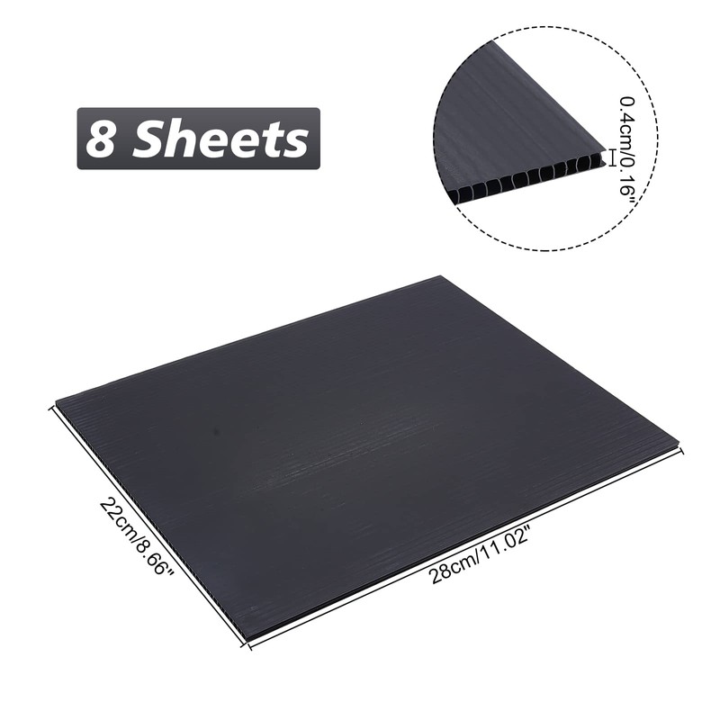 - Quantity Size: You get 8 sheets of black corrugated plastic sheets, they measure about 11.02" (28cm) wide, 8.66" (22cm) long, 0.16" (0.4cm) thick, sufficient quantity and the right size can Meet your different needs.