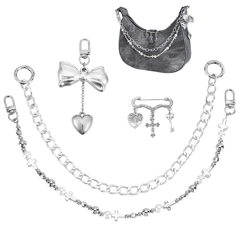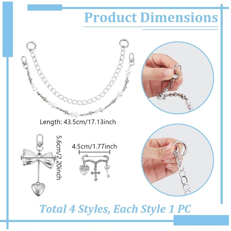 - Value Pack: You will receive 2 pcs bag extender chains, 1 pc bowknot charm, 1 pc cross brooch charm. These 4 in one bag charms are kind of a small scale way to experiment with personalization and something that is representative of your style, or maybe a sentimental memory for you in a very small way