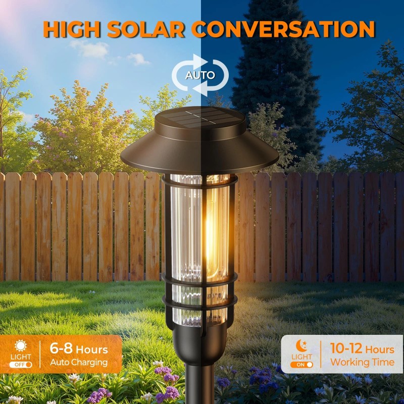 Unique Pathway Lights in 2025: Elevate your outdoor space with these pathway lights solar powered. Featuring a scalloped top design and striped transparent shade with LED tungsten filament bulbs. 2700K warm white solar lights outdoor not only add a delightful touch of elegance but also emit an evenly bright and soft lighting, providing lighting and decoration for various outdoor spaces, such as gardens, lawns, and pathways. Our timeless pathway lights add storybook charm to porches, walkways, and backyard, landscapes, creating enchanting evenings under the stars.