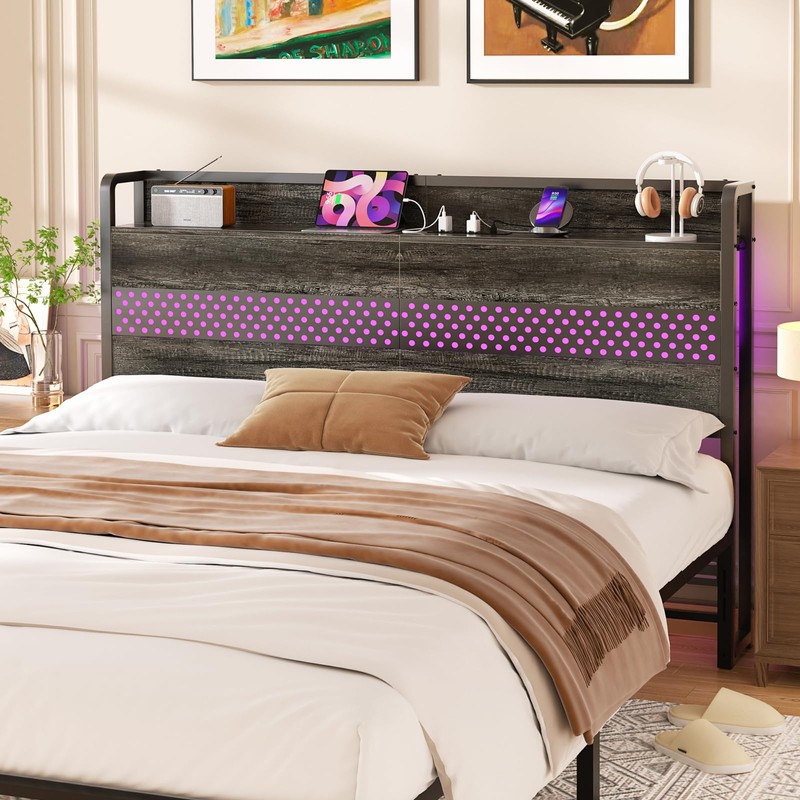 Aheaplus Headboard for Queen Size Bed with USB Ports, Outlets and LED Lights, Queen Headboard with Storage Shelf, Sturdy Metal Frame, Height Adjustable, Bed Frame Mount, Grey Oak