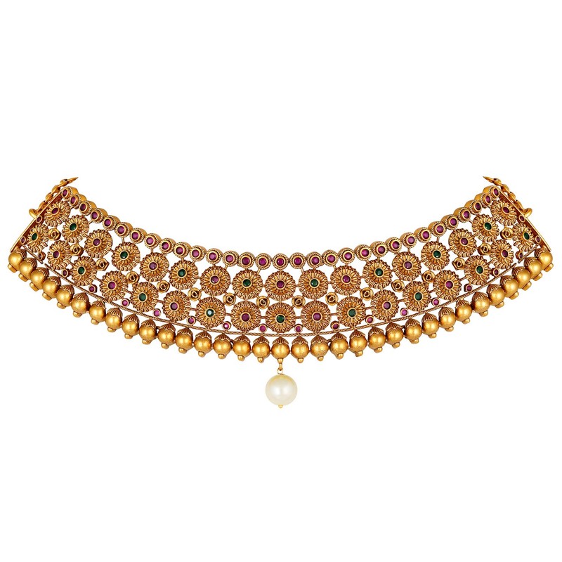 Aheli Antique Gold Tone Choker Necklace Jhumki Earrings Set Studded with Faux Stones Indian Wedding Fashion Jewelry Gift for Women