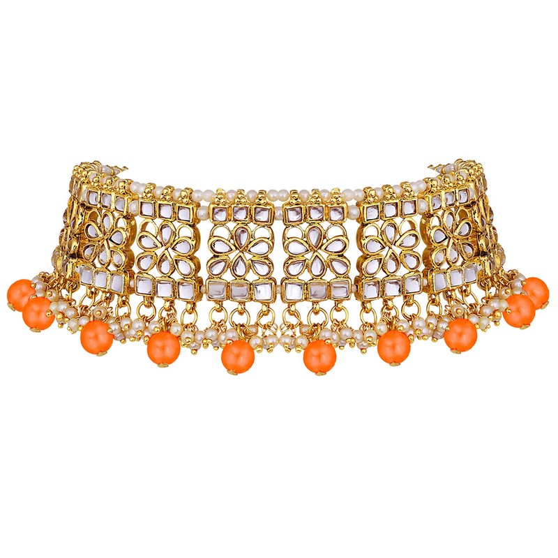 Aheli Elegant Indian Faux Kundan Studded Choker Necklace with Maang Tikka Set Ethnic Wedding Wear Fashion Jewelry Gift for Women Orange