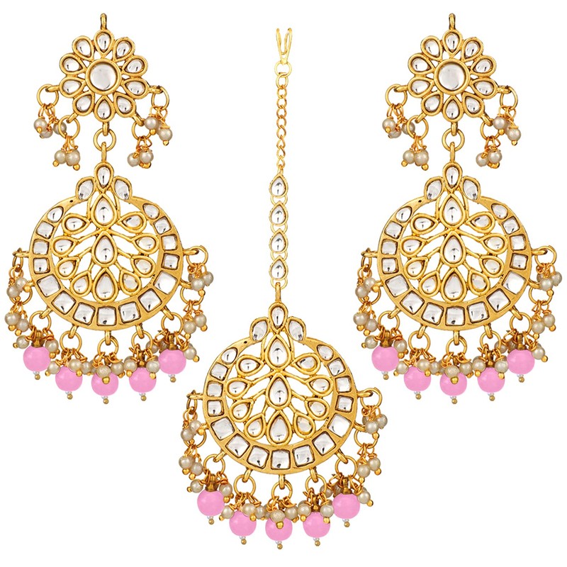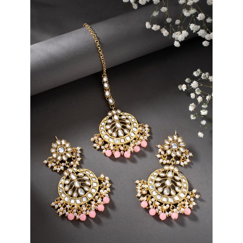 Aheli Exquisite Design Pink Colored Faux Kundan Chandbali Earrings Maang Tikka Set Ethnic Indian Jewelry Gift for Women