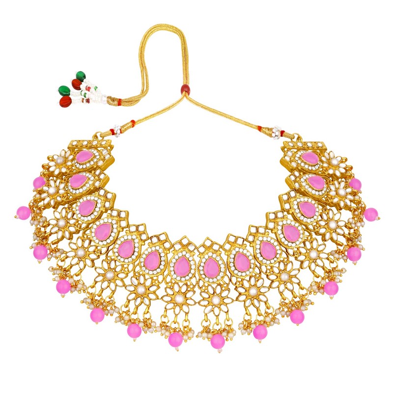 Aheli Gold Plated Kundan Dangling Pearls Necklace Earring Maangtikka Jewellery Set Gift for Women Pink
