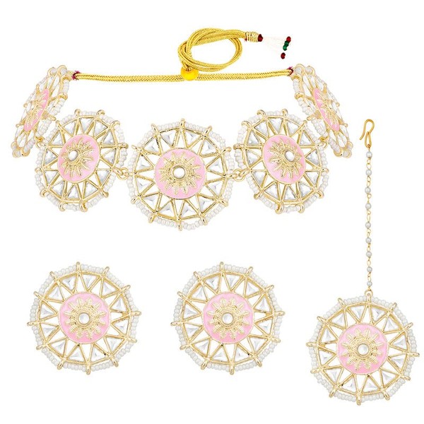 Aheli Gold Plated Kundan Studded Choker Necklace Stud Earrings & Maang Tikka Ethnic Fashion Jewellery Set Gift for Women