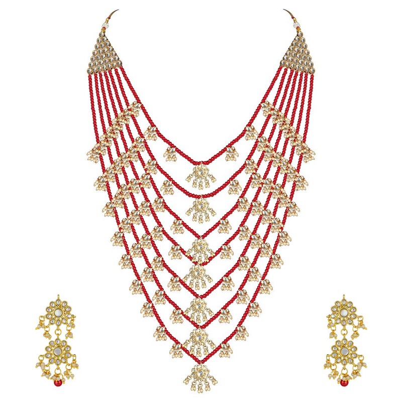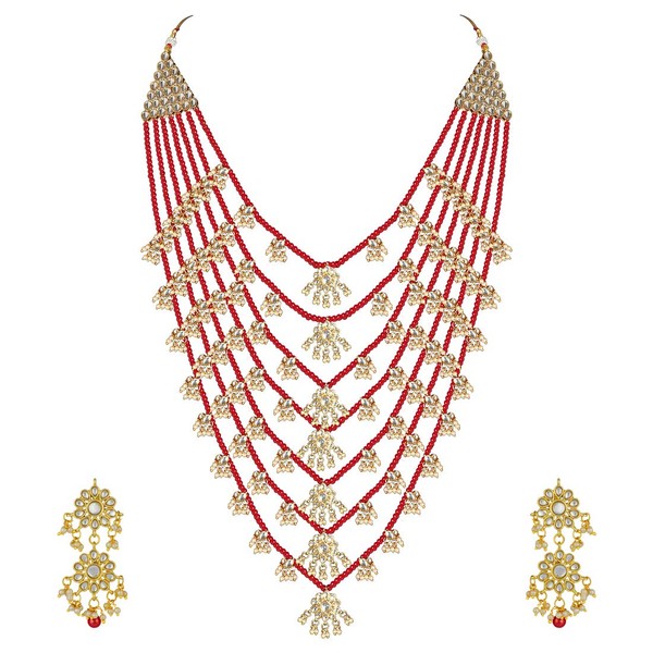 Aheli Multi Layered Red Pearl con Kundan Collar Pendiente Indio Tradicional Ética Joyería de Bollywood