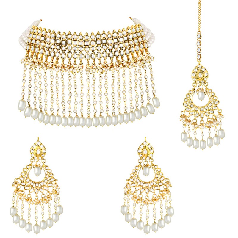 Aheli White Indian Ethnic Wedding Wear Faux Pearl Beaded Choker Necklace with Maang Tikka Set Bollywood Party Fashion Jewelry Gift for Women