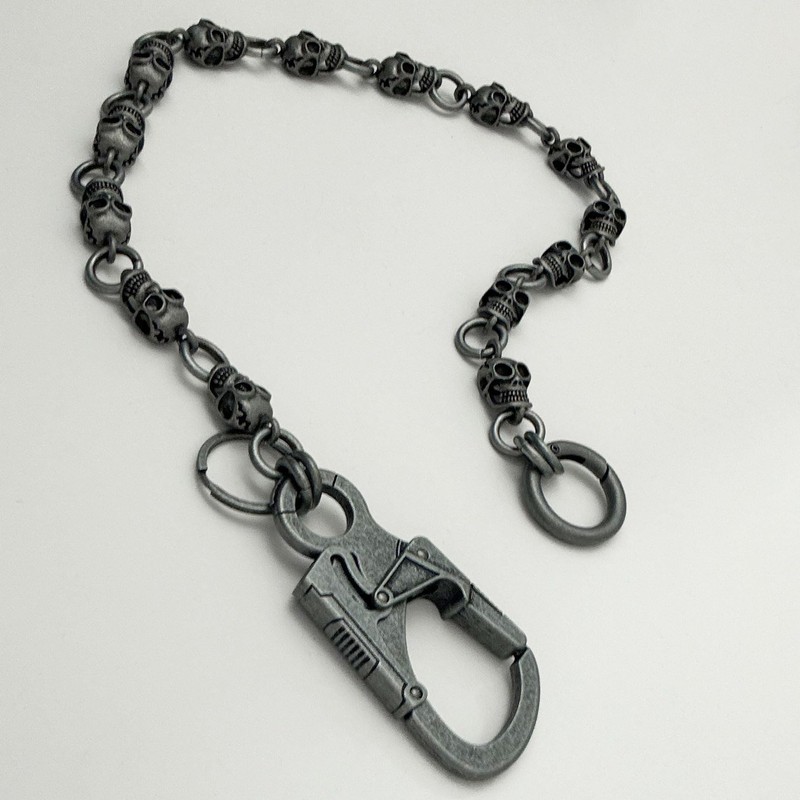 - Material: the skull of our trouser chain is made of heavy-duty alloy, features a durable double lock key chain and a metal spring O-ring clip, and is equipped with two small stainless steel circles at both ends to prevent the skull from tipping over when wearing