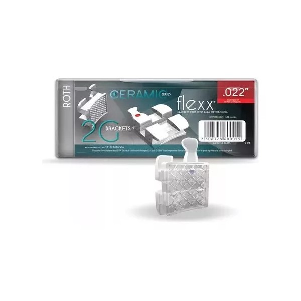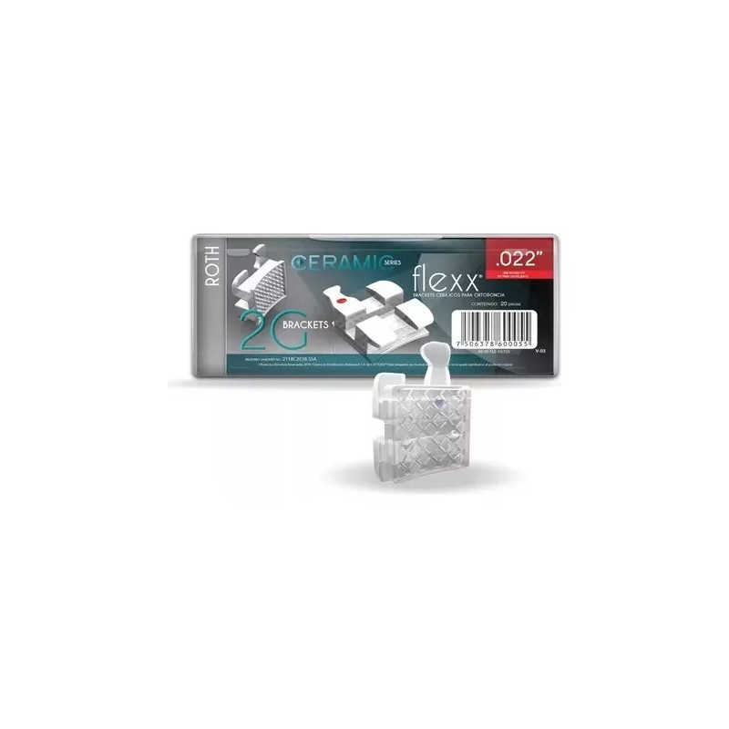 Bracket Ceramic Roth Flexx®. Bracket estético de cerámica poli cristalizada con una pureza de 98.8%. Elaborado de una sola pieza con tecnología especial de sinterización que incrementa la fuerza y la resistencia del bracket, otorga una textura de cristales con efecto invisible. Su diseño es anatómico, ergonómico y aerodinámico que asegura la comodidad y estética del paciente