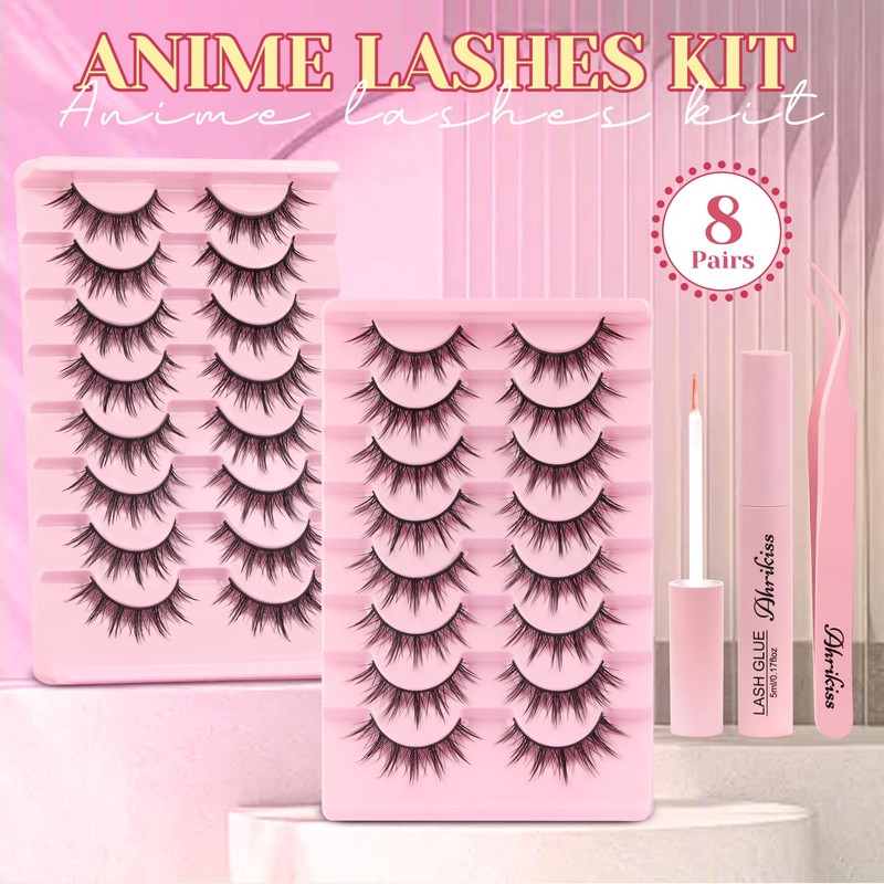 Ahrikiss Lashes Manga Lashes Natural Look Anime False Eyelashes 8 Pairs Faux Mink Lashes Kit with Lash Glue and Lash Tweezers Soft Wispy Fake Eyelashes Cosplay Spiky Strip Lashes (Comic Kit)