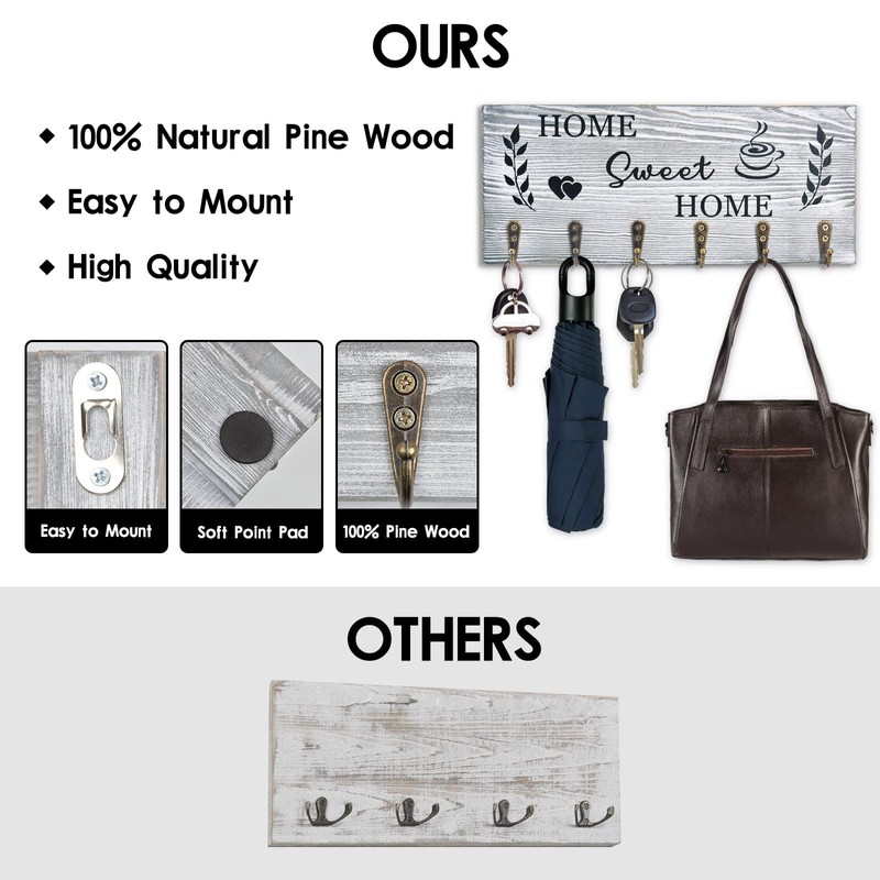 - SIMPLE AND RUSTIC KEY HOLDER FOR WALL: Key hanger for wall made of 100% pine wood, has a nice natural texture, perfect as a beautiful addition to your farmhouse/hallway. The key rack for wall is printed with words - " Home Sweet Home " text style to add a touch of warmth to your home.