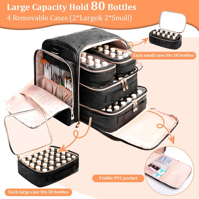 - 【4-IN-1 Nail Bag Hold 80 Bottles】AHZSKE Nail polish organizer shoulder bag contains 4 inner removable pouches (2 large& 2 small) with a total of 80 slots for nail polish (15ml/0.5 fl.oz). Each comes with a soft detachable sponge to keep your nail polish safe from bumps.