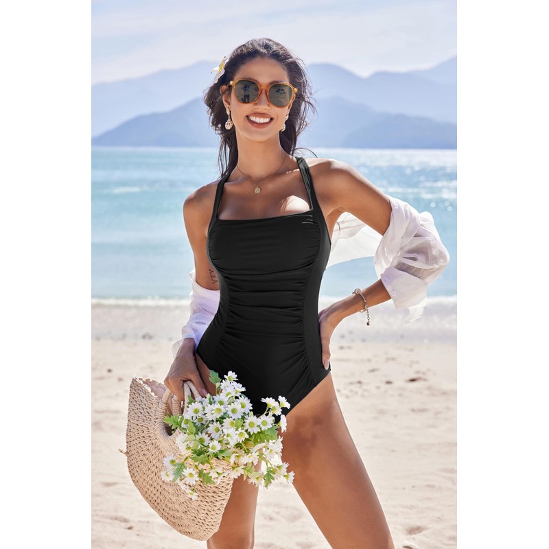 - Show off your curves: Vintage swimsuit for women with a square neckline and adjustable straps all over the gathers that visually slims, conceals, and smoothes the tummy and hips