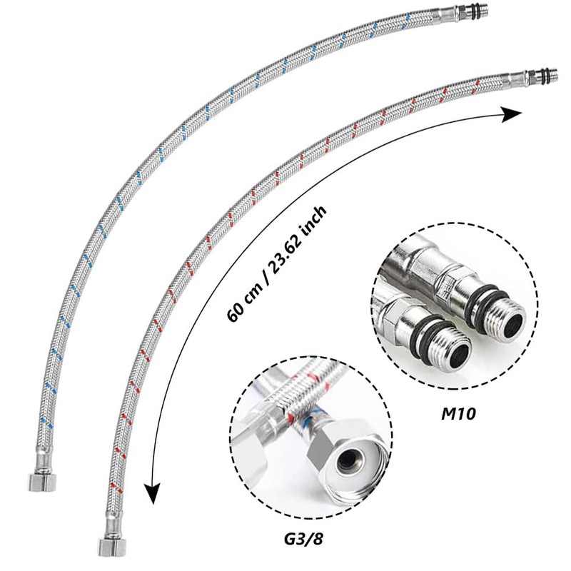 - Connection hose fitting: 2 pieces hot and cold stainless steel hoses, the connection hose is the length of 60 cm; G3/8 inch union nut x M10 for connecting tap and angle valve; DN8 flexible hose including sealing ring.